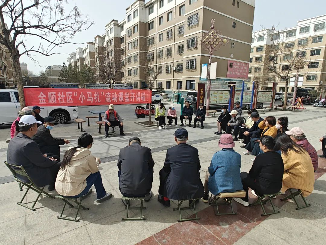 3月25日的下午风和日暖,阳光洒在金顺社区金顺花园小区的中心广场上,群众三三两两汇聚在一起,围坐成一个圆环,新一期的“小马扎”流动课堂正在暖心开讲。
