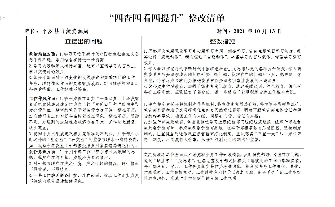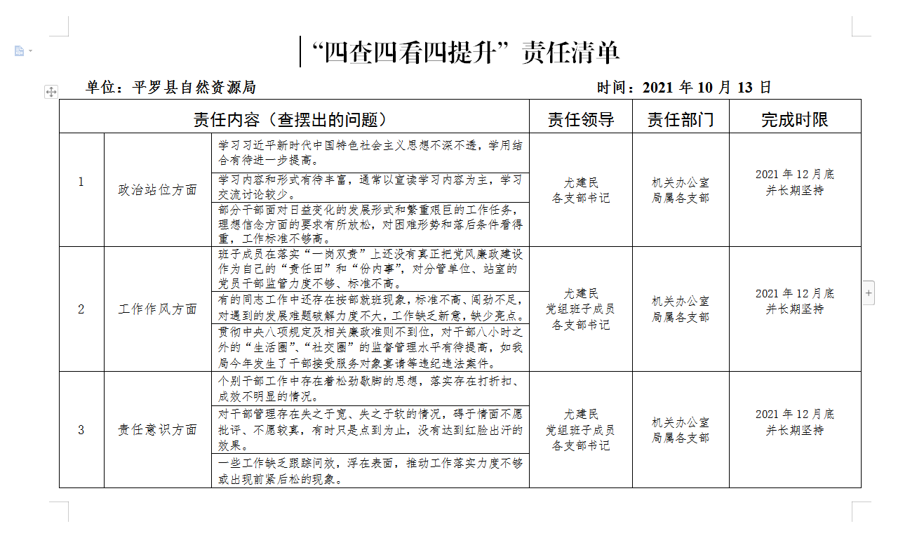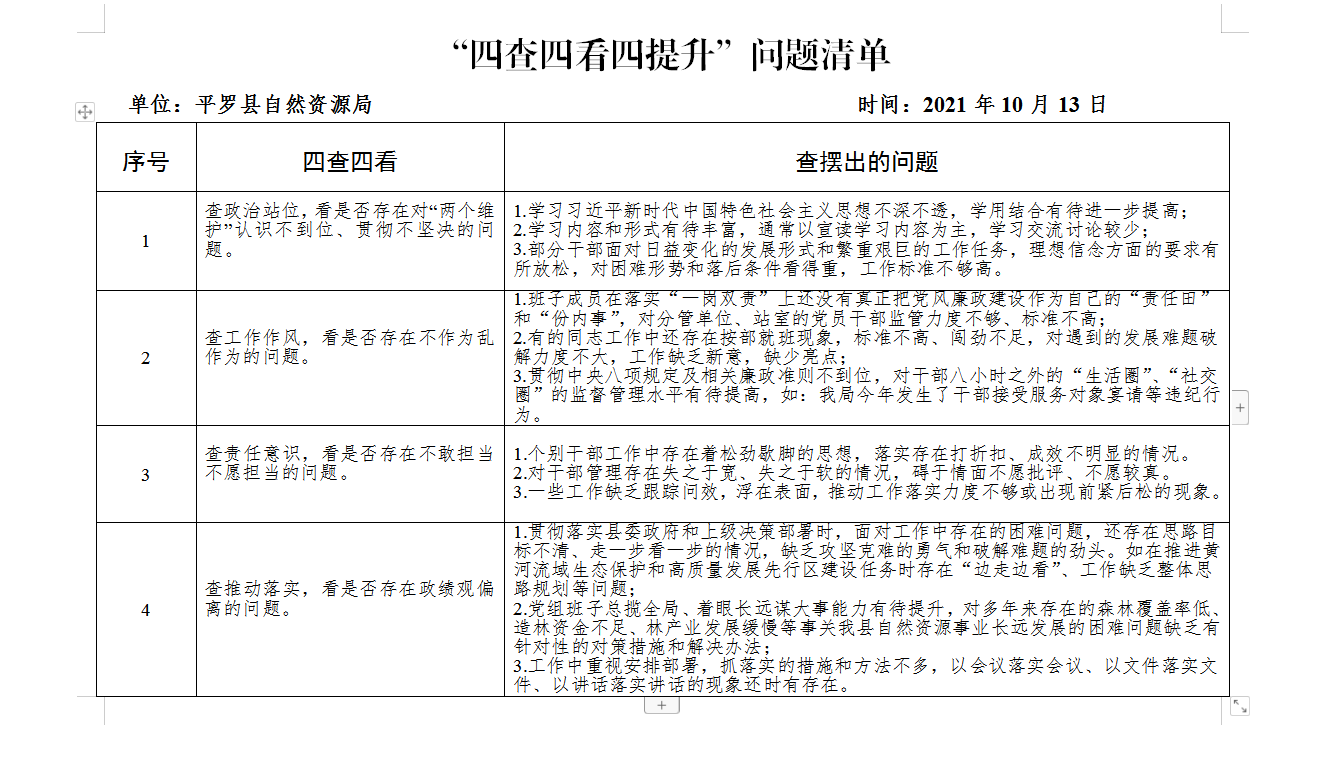 平罗县自然资源局“四查四看四提升”三个清单