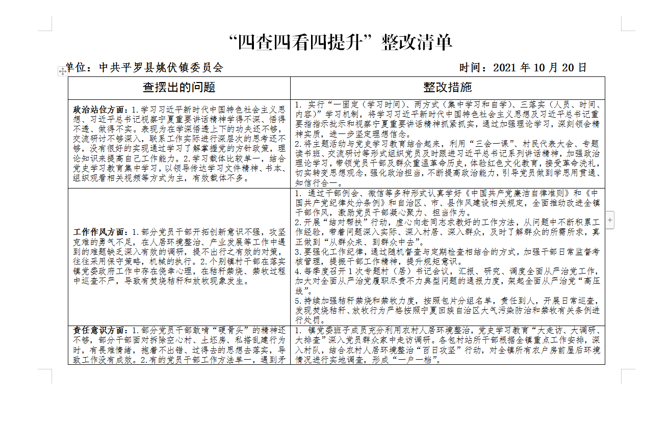 平罗县姚伏镇“四查四看四提升”三个清单