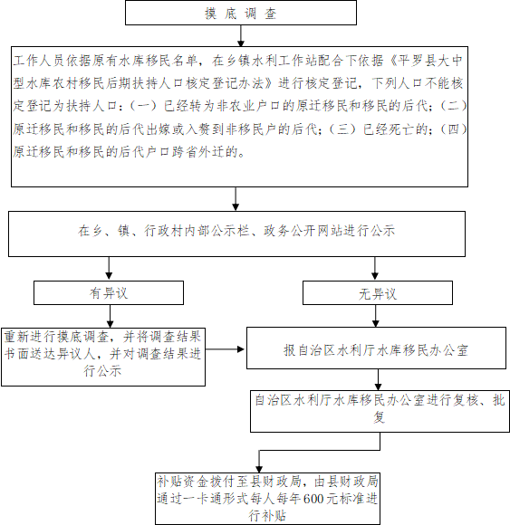 4.1水库移民补贴对象确认方法为:工作人员依据原有水库移民名单,在乡镇水利工作站配合下依据《平罗县大中型水库农村移民后期扶持人口核定登记办法》进行核定登记登记。