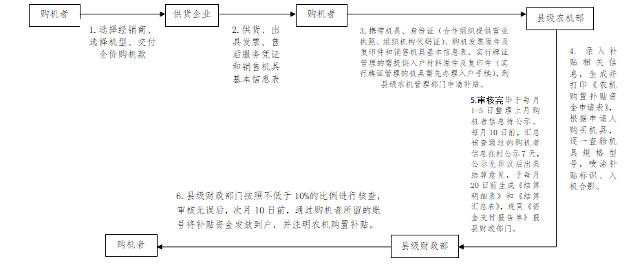 县农机部门录入补贴相关信息,生成并打印《农机购置补贴资金申请表》,根据申请人购买机具,逐一查验机具规格型号,喷涂补贴标识、人机合影。