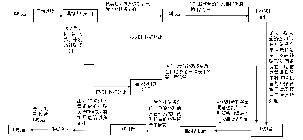 县财政部门确认补贴款全额退回后,在补贴资金申请表和发票上签署补贴已退,可退货在补贴信息管理系统中将该购机者的补贴资金申请表按照申请退货处理。